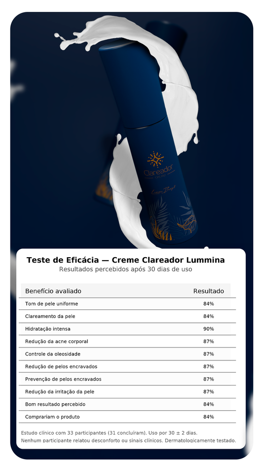 Os primeiros sinais de hidratação e melhora na textura aparecem já nas primeiras semanas. Nos testes clínicos, 84% das pessoas relataram clareamento visível após 30 dias de uso contínuo.